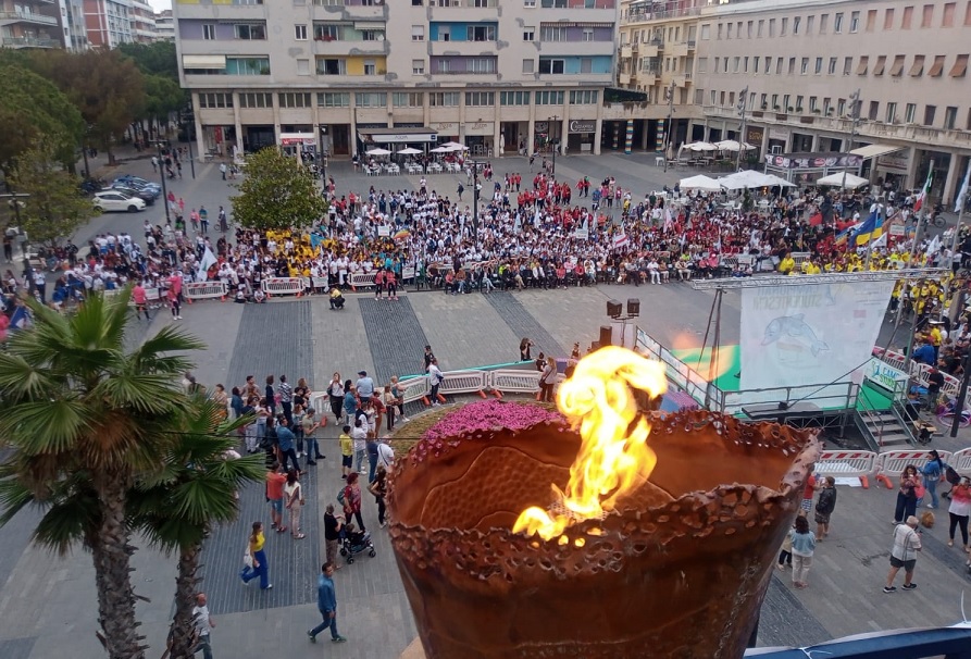 Malgrado il maltempo il cuore della città ha accolto migliaia di atleti e appassionati. Come da programma la cerimonia ha avuto inizio alle 18,30. Il corteo è stato aperto dalla Banda Musicale dell’Associazione Rossini aps di Elice. In chiusura una performance di pattinaggio artistico con la presenza di Filippo De Ritis campione italiano Fisr categoria cadetti inline e Jennifer Di Luzio campionessa italiana Fisr categoria cadetti inline e 4° classificata ai campionati Europei 2021, entrambi in forza all’asd EVOLUTION SKATING DANCE. Bella anche la coreografia curata dall’associazione Culturale “Music e dance” di Sulmona. Particolarmente suggestivo è stato l’arrivo della fiaccola olimpica. La torcia che, gli organizzatori hanno fatto arrivare dal corso, alla fine è stata presa da Rita Stromei, una pescarese con un passato importate nello sport e che ha trascorso una vita intera come docente di educazione fisica delle scuole superiori di Pescara e che si accinge a chiudere anche questa sua meravigliosa esperienza da insegnante. Toccante e particolarmente curata è stata la coreografia diretta da Laura Del Re.