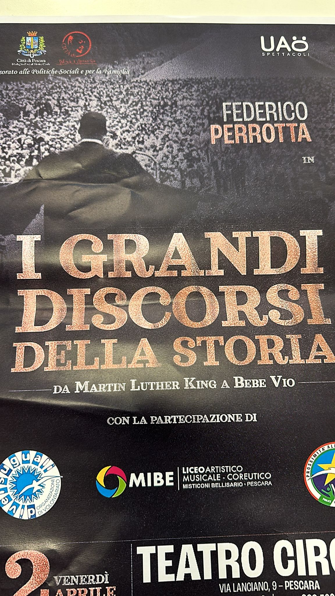 “Dal celebre I Have a Dream di Luther King a “La vita è una figata pazzesca” di Bebe Vio proviamo a ripercorrere la storia attraverso i discorsi che hanno più caratterizzato determinate epoche – spiega Federico Perrotta – lo faremo con la giusta leggerezza non per sminuire determinati messaggi, ma per renderli ancora più efficaci. Lo faremo con l’aiuto di attori professionisti, ma soprattutto grazie alla presenza in scena dei giovani studenti del Liceo Artistico “Misticoni- Belisario” di Pescara e i fantastici ragazzi dell’associazione di Gianna Camplone “Diversi Uguali”.