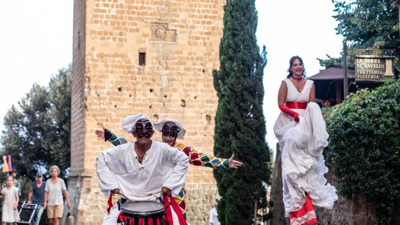 La Parata di Arlecchino e Pulcinella è messa in scena dal Teatro Potlach di Fara Sabina. Protagonisti dello spettacolo itinerante sono Natalie Menta, Marcus Akauan, Zsofia Gulyas e altri artisti. La passeggiata di attrazioni è guidata da un’elegante figura femminile sui trampoli, assieme ad Arlecchino e Pulcinella, con percussioni, musica e danze. Il pubblico viene trasportato nel mondo della fantasia, tra balli sui trampoli, abilità circensi, percussioni dal vivo, costumi colorati.