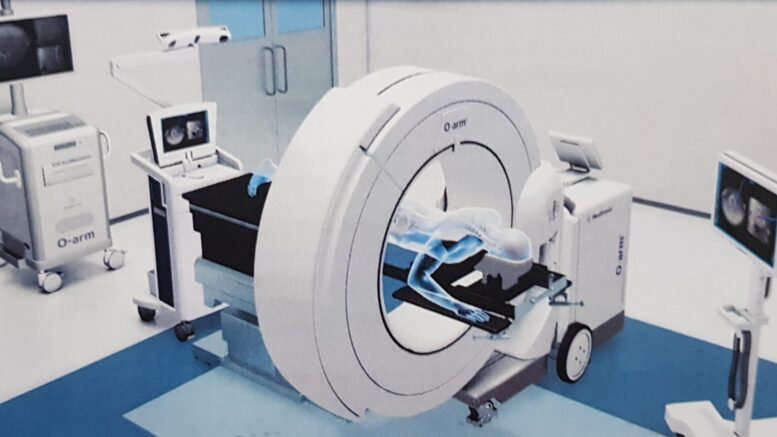 «O-Arm potrà essere impiegata anche negli interventi sul cranio sempre con lo stesso sistema: navigando senza dover ricorrere a radiografie continue e procedendo senza l’emissione di raggi.»