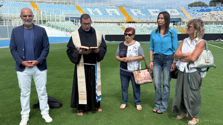 Foto scattata durante la benedizione del campo dell’Adriatico, poco fa. L’iniziativa è di Nella Grossi, delle Donne Biancazzurre, che ha coinvolto il sacerdote di Sant’Antonio Don Mauro