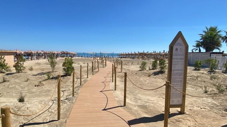 La spiaggia avrà dei cordoni dunali con gli elementi vegetali da inserire e degli elementi non vegetali, quali la passerella centrale con pedane e slarghi, le vele ombreggianti, la recinzione palo/corda, molto presto anche le panchine, il totem informativo e mappe informative che costituiscono l’insieme del progetto.