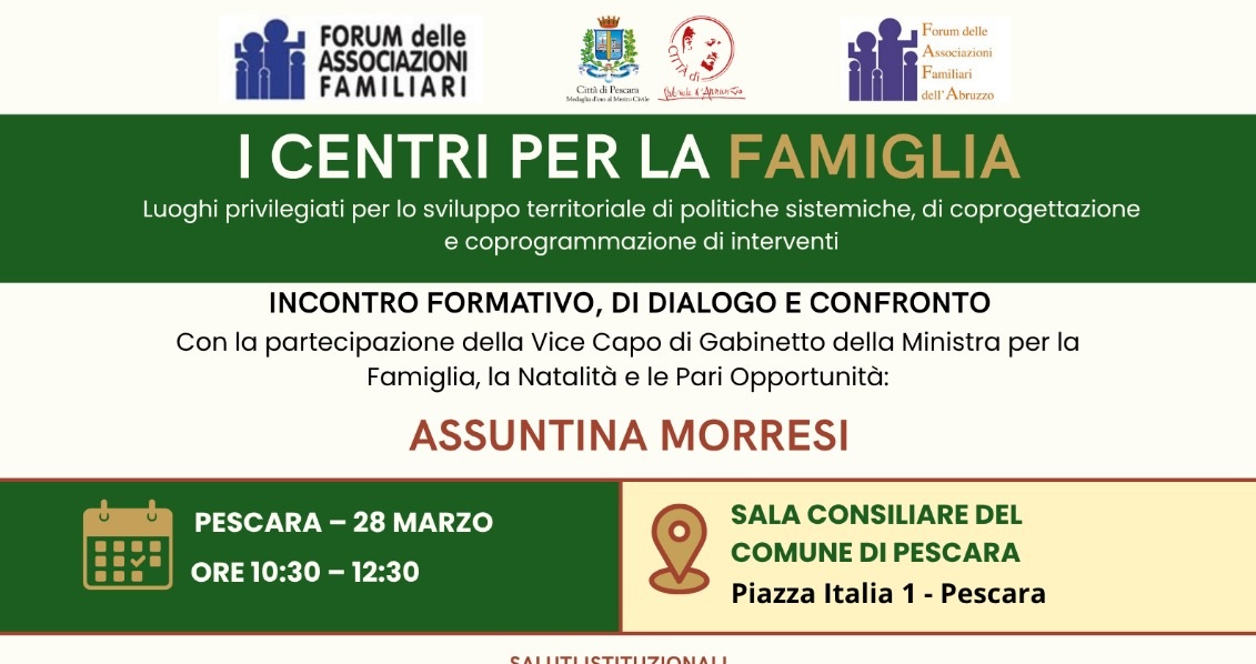 Si terrà domani dalle ore 10:30 alle 12:30, presso la Sala Consiliare del Comune di Pescara, l’appuntamento formativo e di dialogo sul tema dei Centri per la Famiglia promosso dal Forum delle Associazioni Familiari dell’Abruzzo, con il patrocinio del Comune di Pescara ed in collaborazione con il Forum nazionale delle Associazioni Familiari.