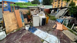 Sorvolando sulla città, durante un servizio di controllo speciale del territorio dall’alto, la Guardia di Finanza ha individuato, in piena città, un sito interamente recintato e ben protetto dalla normale visuale: nascoste al suo interno strutture abusive utilizzate per lo svolgimento di attività economiche e per lo smaltimento di rifiuti speciali pericolosi.