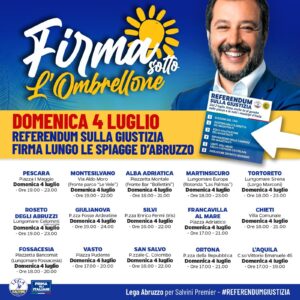 Alle 10:30 a Pescara, alle 16:30 a L’Aquila: lunedì abruzzese per Matteo Salvini. 27 i gazebo della Lega, sabato e domenica, per la raccolta di firme per il referendum sulla Giustizia.