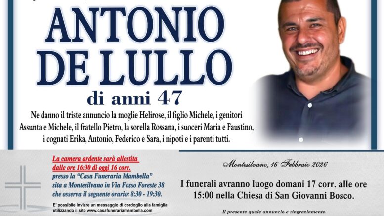 De Lullo lascia la moglie Helirose, il figlio Michele, i genitori Assunta e Michele, il fratello Pietro, la sorella Rossana, i suoceri Maria e Faustino, i cognati Erika, Antonio, Federico e Sara.