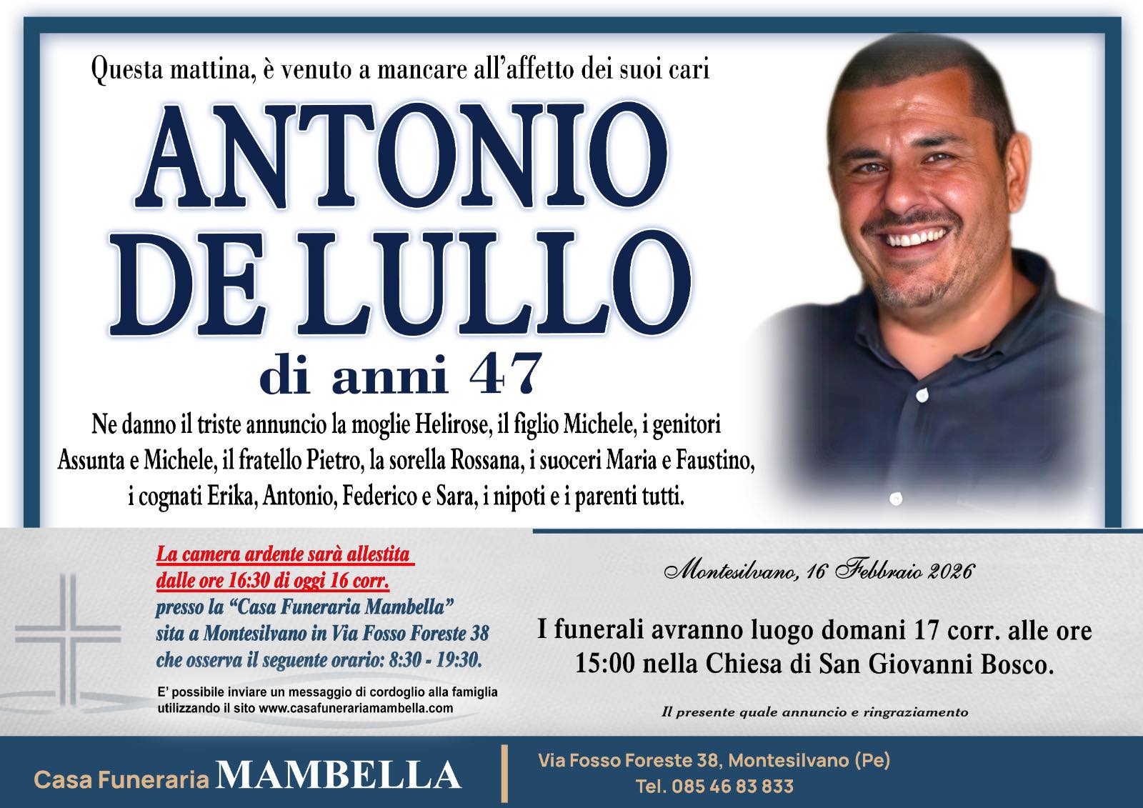 De Lullo lascia la moglie Helirose, il figlio Michele, i genitori Assunta e Michele, il fratello Pietro, la sorella Rossana, i suoceri Maria e Faustino, i cognati Erika, Antonio, Federico e Sara.