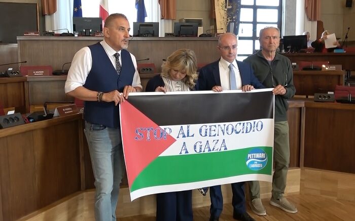 Questa mattina, nel corso del Consiglio comunale di Pescara Domenico Pettinari, Massimiliano Di Pillo e Caterina Artese, Presidente e consiglieri comunali del Movimento Politico “Pettinari per l’Abruzzo” hanno aperto uno striscione con sullo sfondo la bandiera della Palestina e con la scritta “Stop al genocidio di Gaza”
