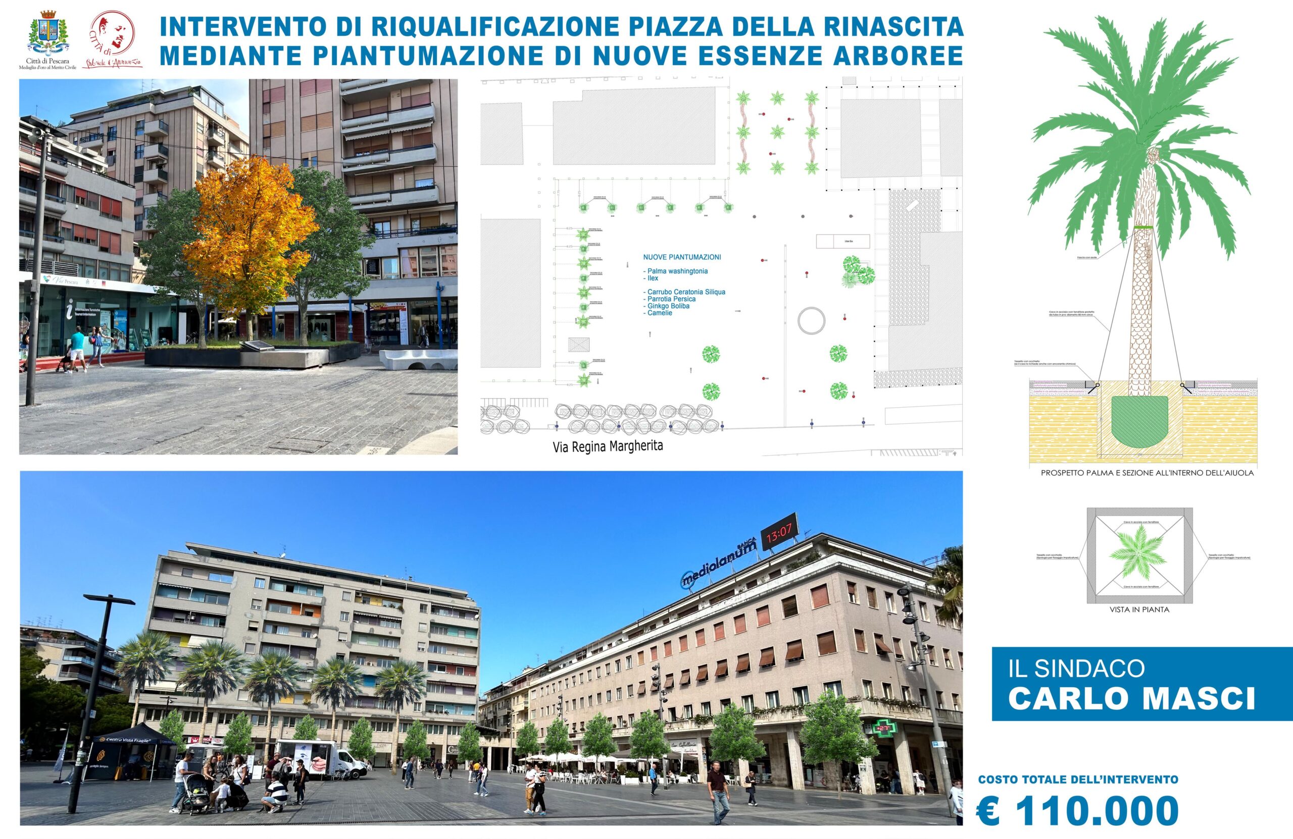 Sempre più alberi nella zona centrale della città. Mentre proseguono i lavori in corso Umberto e piazza Sacro Cuore, dove il nuovo assetto del verde ha già sostituito i lecci morti ormai da anni, il sindaco Carlo Masci annuncia l’avvio dell’intervento in piazza della Rinascita. Il cantiere prenderà il via lunedì e durerà una decina di giorni, dice il primo cittadino che aveva già spiegato i contenuti del progetto nelle scorse settimane, dopo l’approvazione in giunta.