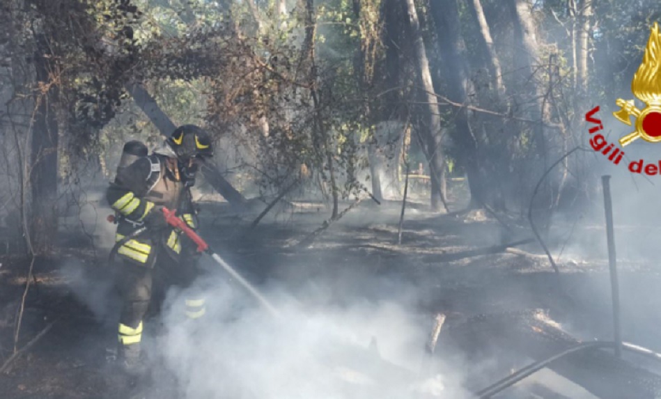Vigili del Fuoco impegnati nelle operazioni di spegnimento di un incendio che si è sviluppato nei comparti 3 e 4 della riserva Pineta Dannunziana, nella zona Sud di Pescara.