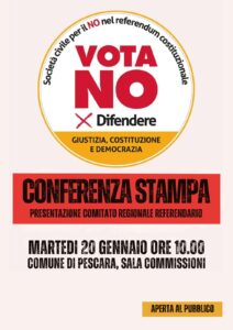 Si intensifica la mobilitazione politica per il referendum costituzionale sull’ordinamento della magistratura. Si è costituito infatti anche in Abruzzo il Comitato regionale della “Società civile per il No al referendum costituzionale”. Al comitato aderiscono molte realtà del territorio tra le quali Ali, Arci, Anpi, Auser, Cdc, Cgil, Federconsumatori, H2O, Legambiente, Libera, Libertà e Giustizia, Pax Christi, Sunia, Udu, Uds.