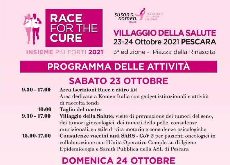 Il Villaggio della Salute della Race for the Cure di Komen Italia torna a Pescara, in piazza della Rinascita, sabato 23 e domenica 24 ottobre, dalle ore 9:30 alle 17:00, durante il Breast Cancer Awareness Month, per erogare gratuitamente e previa prenotazione, esami specialistici e prestazioni clinico-diagnostiche di prevenzione delle principali patologie oncologiche di genere a donne appartenenti a categorie socio-economiche svantaggiate e fuori dalle fasce screening previste dal Sistema sanitario nazionale (50-69 anni).