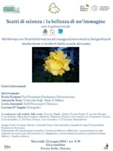 La giornata avrà inizio alle 9.30 nella sala consiliare del Comune. “Scatti di scienza” è patrocinata dal Comune di Pescara e dall’Università d’Annunzio Chieti-Pescara, con il contributo della Fondazione PescarAbruzzo.