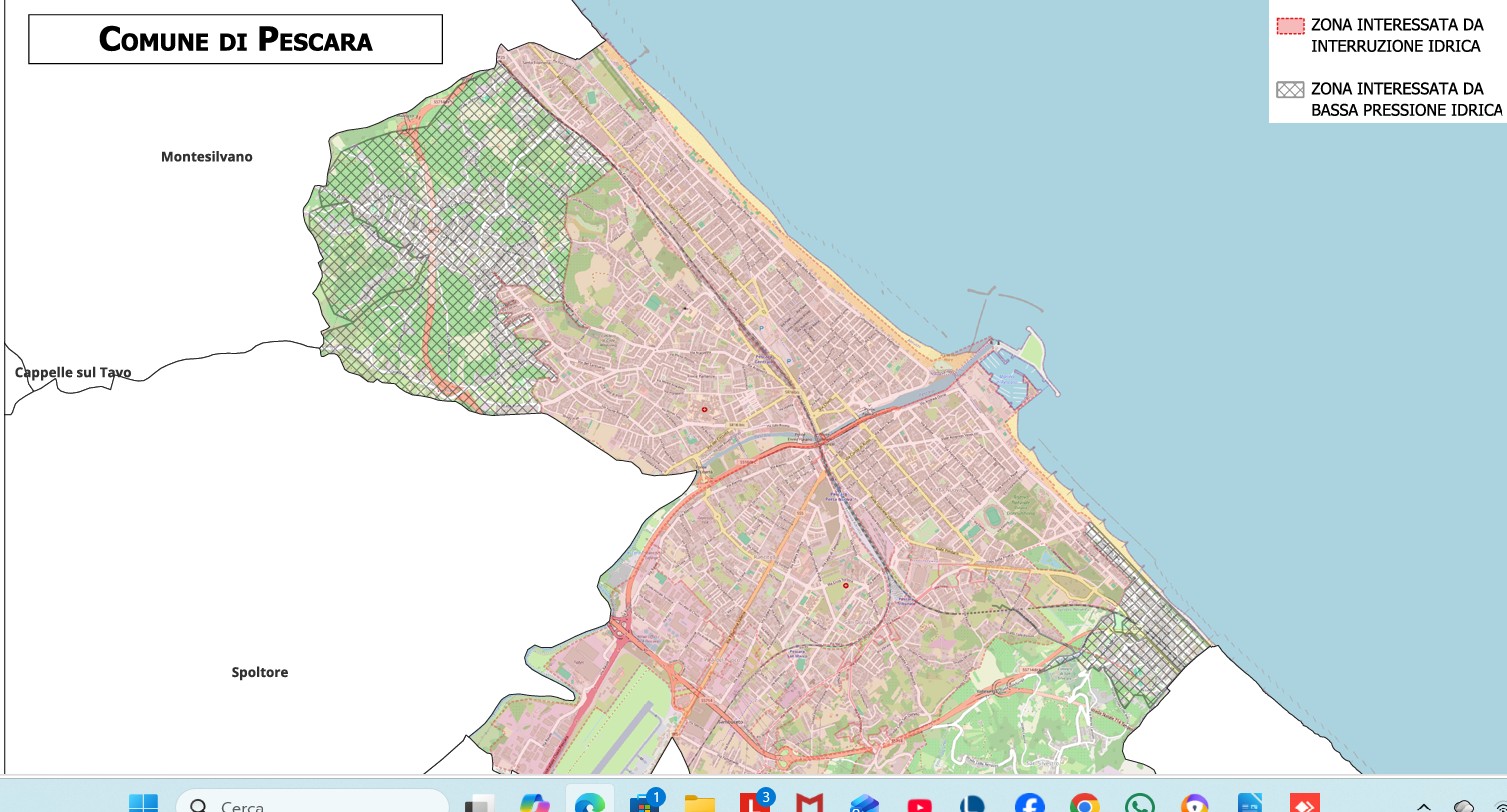 A Pescara interessate saranno: zona di Colli Innamorati e traverse, parte alta di Via di Sotto e traverse, Via Colle di Mezzo, Via Pandolfi, Strada Colle Scorrano, tutte zone alimentate dal Serbatoio Valle Furci (serbatoio terminale del Tavo sud), che è stato integrato con l’acqua proveniente dall’acquedotto Giardino per limitare il disagio.