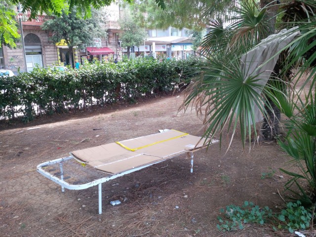 L’immagine, piuttosto eloquente, si inserisce nell’emergenza homeless all’interno della pinetina che lambisce la stazione vecchia e il terminal bus di Pescara, un’area già interessata da ripetute operazioni di polizia e da diversi sgomberi, ma che puntualmente viene rioccupata e utilizzata per il bivacco diurno e notturno. La foto inviata da Foschi è corredata da un commento ironico posto a mo’ di didascalia: