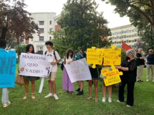 Pomeriggio di protesta a Pescara dove studenti e docenti del “Liceo Marconi” si sono dati appuntamento nel giardino che collega il palazzo della Provincia a quello del Comune per manifestare il dissenso verso la soluzione delle 5 sedi per il prossimo anno scolastico.