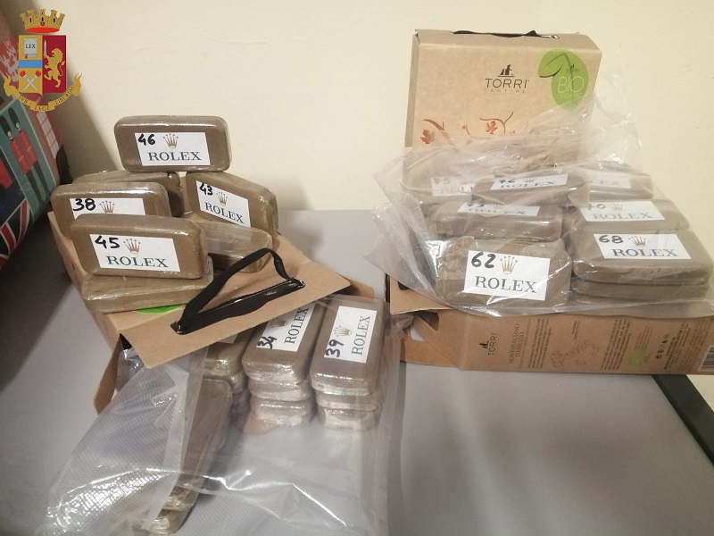 In arresto un pescarese di 31 anni, residente a Montesilvano, e due cittadini rumeni, tra di essi sposati, di 38 anni e 43 anni. Tutto è partito da un controllo ad un posto di blocco, sebbene la polizia fosse sulle tracce dei tre già da alcuni giorni per movimenti sospetti segnalati nell’appartamento del lungomare nord di Pescara. Nel tentativo di sfuggire al posto di blocco, il 31 enne è finito con la sua auto contro quella della polizia. Dall’immediato controllo, celati nel vano bagagliaio gli agenti hanno trovato un borsone ed un trolley all’interno dei quali vi erano 10 involucri sigillati di marijuana del peso complessivo di circa 11 kg e 50 panetti da 100 grammi di hashish. Una volta giunti nell’appartamento sospetto, occultati in due trolley posti sul balcone della camera da letto gli agenti hanno scovato altra droga: 21 kg di marijuana oltre alla somma contante di 8.800 euro. Associati presso le case circondariali di Vasto e Teramo, per il reato di detenzione di sostanza stupefacente, sia il proprietario dell’autovettura che i due cittadini rumeni. L’operazione, coordinata dalla Questura di Chieti, ha consentito di sferrare un importante colpo alla criminalità togliendo dalla piazza un quantitativo ingentissimo di stupefacente, destinato al mercato locale, per un valore di circa 250.000,00 euro.