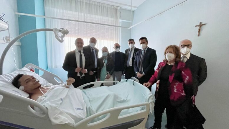 A tutto lo staff medico ed infermieristico il sentito ringraziamento del presidente Marsilio un istante prima di entrare nella stanza di Yelfry: ad accompagnare Marsilio, Masci, la Verì ed altri la mamma del giovane cuoco 23enne. Pochi minuti in sua compagnia, per non farlo affaticare troppo, in cui il dolore ha lasciato sul volto di tutti spazio a sorrisi di speranza con un corale augurio ad un arrivederci fuori da quella stanza di ospedale.