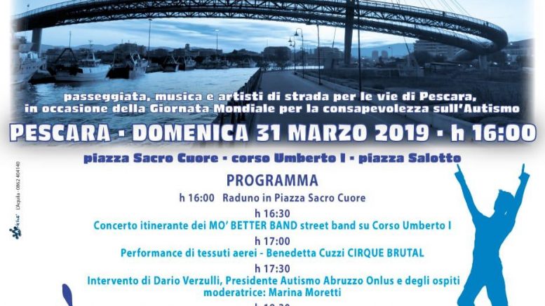 Si comincerà alle ore 16, raduno in piazza Sacro Cuore. Alle 16.30 il festoso corteo si dirigerà verso piazza Salotto, accompagnato dalla musica trascinante dei Mo’ Better Band che darà vita ad un vero e proprio concerto itinerante. Alle 17, arrivati in piazza, Benedetta Cuzzi e il suo Cirque Brutal si esibiranno in una emozionante performance di tessuti arerei. Alle 17.30 intervento di Dario Verzulli, presidente di Autismo Abruzzo Onlus, e di altri ospiti. Infine, alle 18.30, chiusura della giornata affidata ancora alla musica dei Mo’ Better Street Band.