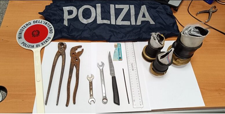 La polizia lo ha notato durante una perlustrazione dell’area, in bicicletta e con il borsone. Dopo averlo seguito fino alla colonnina antincendio nel parcheggio di un negozio lì vicino, la pattuglia ha deciso di fermarlo scoprendo che aveva appena asportato un manicotto in ottone tagliando la tubazione a cui era assicurato. A quel punto sono scattate l’identificazione, le ulteriori verifiche e la perquisizione: nel borsone c’erano chiavi inglesi, tenaglie, pinze e altri due manicotti in ottone opera di un precedente furto, con la parte in tessuto del manicotto visibilmente lacerata.