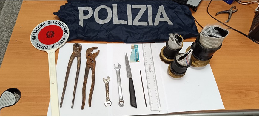 La polizia lo ha notato durante una perlustrazione dell’area, in bicicletta e con il borsone. Dopo averlo seguito fino alla colonnina antincendio nel parcheggio di un negozio lì vicino, la pattuglia ha deciso di fermarlo scoprendo che aveva appena asportato un manicotto in ottone tagliando la tubazione a cui era assicurato. A quel punto sono scattate l’identificazione, le ulteriori verifiche e la perquisizione: nel borsone c’erano chiavi inglesi, tenaglie, pinze e altri due manicotti in ottone opera di un precedente furto, con la parte in tessuto del manicotto visibilmente lacerata.