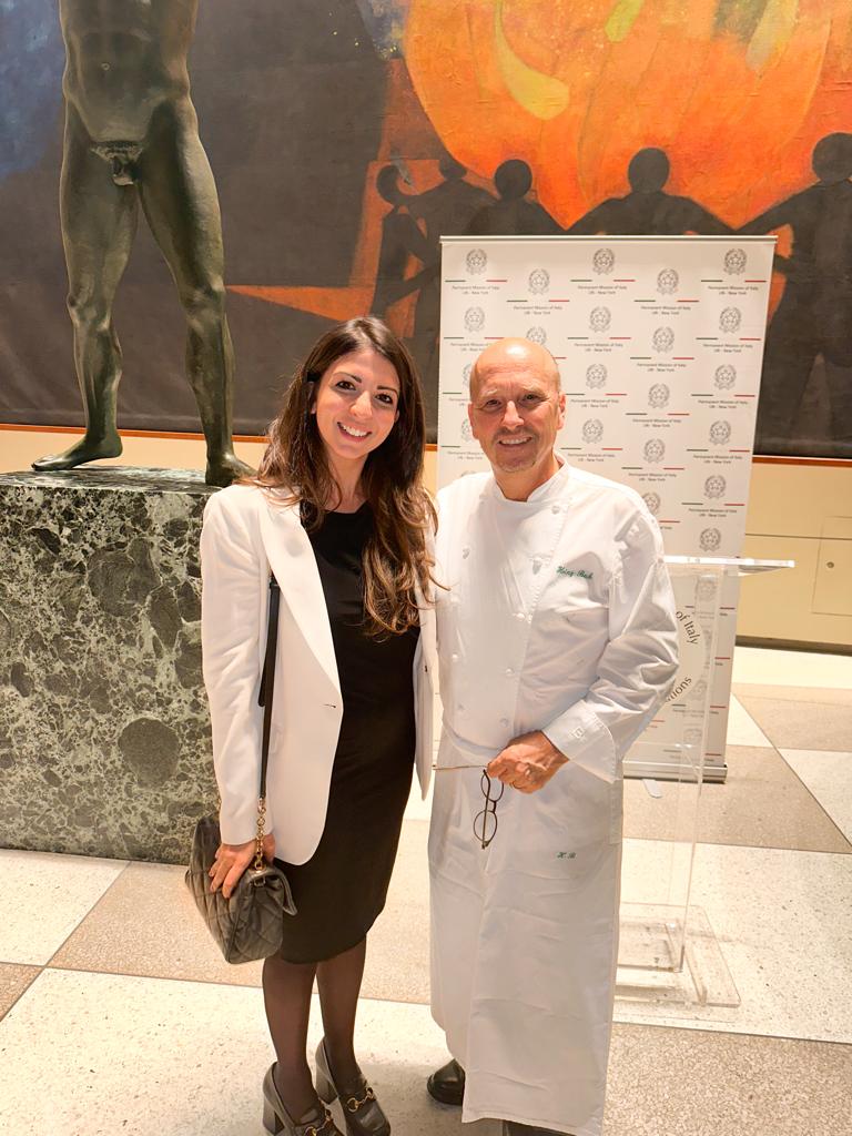 Lo chef ha cucinato per il ricevimento incentrato sulla dieta tradizionale italiana preparando come primi piatti gli Gnocchetti di Zita n.37 De Cecco “cacio e pepe su spuma alle erbe” e il Riso Carnaroli De Cecco “con zucca, caffè e castagne”: ricette sane oltre che gustose.