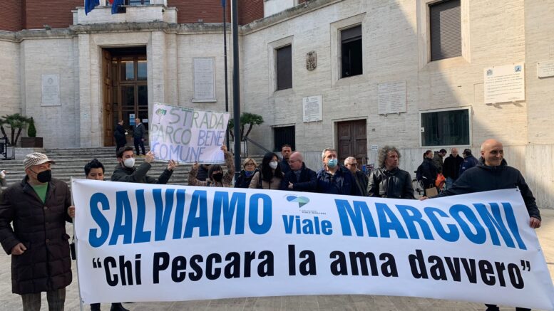 Dopo la protesta del 26 marzo scorso che ha visto commercianti e residenti di via Marconi sfilare in corteo per chiedere la modifica del progetto sull’importante arteria cittadina, questa mattina gli aderenti al Comitato “Salviamo viale Marconi” hanno effettuato un sit in sotto alla sede del Municipio in Piazza Italia. Presente il comitato contro il progetto delle quattro corsie in viale Marconi. Ci sono i residenti lungo la strada Parco mai stanchi di dire il loro no alla filovia. E poi c’è chi vive nella zona della movida esausto per serate insonni ed episodi di violenza. Insomma, oggi a Pescara a contestare Masci ci sono più voci: a dire la propria contro scelte a detta loro troppo penalizzanti anche commercianti esasperati dagli aumenti dei parcheggi a pagamento. Sotto a Palazzo di Città i rappresentanti del Comitato Salviamo Viale Marconi, Pescara Viva, Pescara Vecchia, Pescara al Centro, Strada Parco Bene Comune.