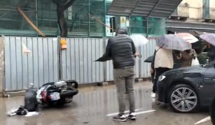 Sull’asfalto, reso viscido dalla forte pioggia, la scivolata di una moto il cui conducente è rimasto a terra. L’automobilista coinvolto e diverse altre persone hanno immediatamente prestato soccorso. Il tutto è accaduto in corso Vittorio Emanuele, all’altezza di piazza della Repubblica (ex stazione ferroviaria). I primi soccorsi sono stati chiamati dai tanti testimoni presenti nella zona.