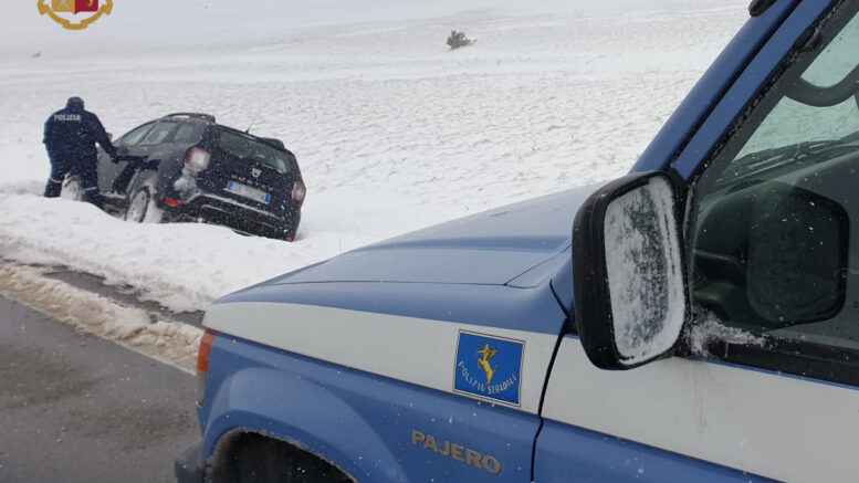 Auto fuori strada a causa della bufera di neve lungo la Piana delle Cinque Miglia: in due soccorsi da agenti della Polstrada.