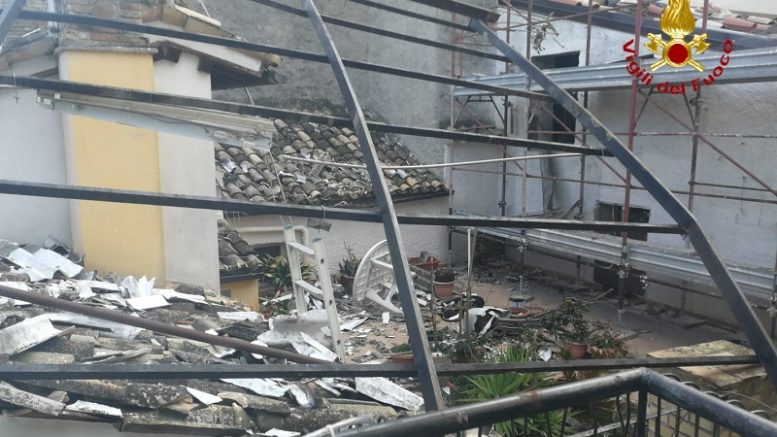 Il crollo ha riguardato uno dei pilastri in mattoni che reggeva la copertura divelta dal vento. I detriti sono finiti a terra danneggiando il tetto di una palazzina di tre piani. I Vigili del Fuoco hanno provveduto alla messa in sicurezza rimuovendo le parti pericolanti e chiudendo le forniture del gas per isolare la perdita. Non ci sono feriti. Oltre ai Vigili sono intervenuti la Polizia municipale, i Carabinieri e il sindaco.