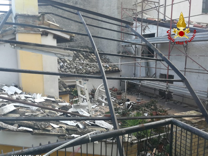 Il crollo ha riguardato uno dei pilastri in mattoni che reggeva la copertura divelta dal vento. I detriti sono finiti a terra danneggiando il tetto di una palazzina di tre piani. I Vigili del Fuoco hanno provveduto alla messa in sicurezza rimuovendo le parti pericolanti e chiudendo le forniture del gas per isolare la perdita. Non ci sono feriti. Oltre ai Vigili sono intervenuti la Polizia municipale, i Carabinieri e il sindaco.