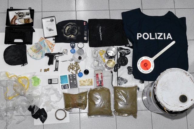 L’uomo è stato, pertanto, tratto in arresto per il reato di detenzione ai fini di spaccio di sostanza stupefacente e per detenzione illegale di arma clandestina e denunciato in stato di libertà per i reati di ricettazione e di detenzione abusiva di munizioni.