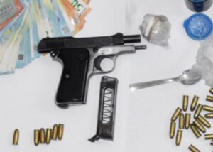 Nella stessa casa è stata rinvenuta anche una pistola di piccolo calibro, pronta per l’uso in quanto munita di colpo in canna e di caricatore completo di nr. 5 colpi e con matricola visibilmente abrasa al fine di renderne difficoltoso il tracciamento. Altre munizioni della stessa arma sono state rinvenute all’interno del comò insieme a 50 proiettili di diverso calibro.