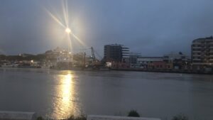 Alle 22.30 di ieri la pioggia a Pescara ha concesso una breve tregua. La fotografia del fiume Pescara testimonia il raggiungimento del livello di guardia.