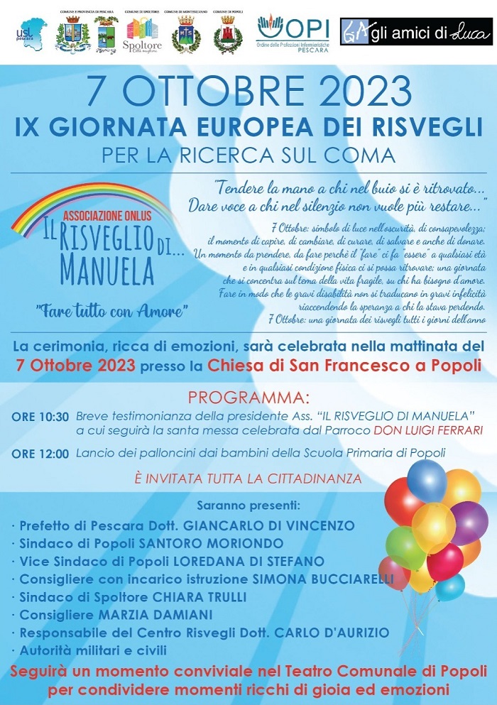 Il 7 ottobre prossimo si svolge la IX Giornata europea dei Risvegli per la ricerca sul coma. A Popoli con l’Associazione onlus Il Risveglio di Manuela ci sarà una manifestazione ricca di emozioni