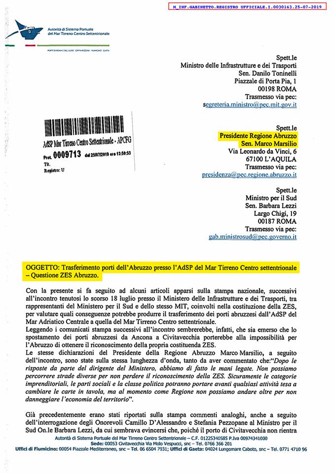 “Sono venuta in possesso di una lettera che Marsilio ha voluto tenere nascosta e che ribalta l’esito del tavolo tecnico del 18 luglio scorso tra Regione Abruzzo, Ministero dei Trasporti e Ministero del Sud. L’ha scritta il Presidente dell’Autorità di Sistema Portuale del Mar Tirreno Settentrionale, l’Avvocato Di Majo. L’ha indirizzata al Presidente dell’Abruzzo e ai Ministri Toninelli e Lezzi. Dice quello che noi ripetiamo da mesi: lo spostamento dei porti abruzzesi sotto l’Autorità di Civitavecchia NON preclude la Zes. È, secondo noi, la corretta interpretazione della legge e creare il corridoio Tirreno-Adriatico con l’Abruzzo protagonista sarebbe possibile senza rinunciare a niente. Significa che la nostra Regione potrebbe concretamente programmare un percorso di crescita per i prossimi 50 anni, fatto di investimenti, infrastrutture, LAVORO. Sapete cosa manca per farlo? La volontà di Marsilio!