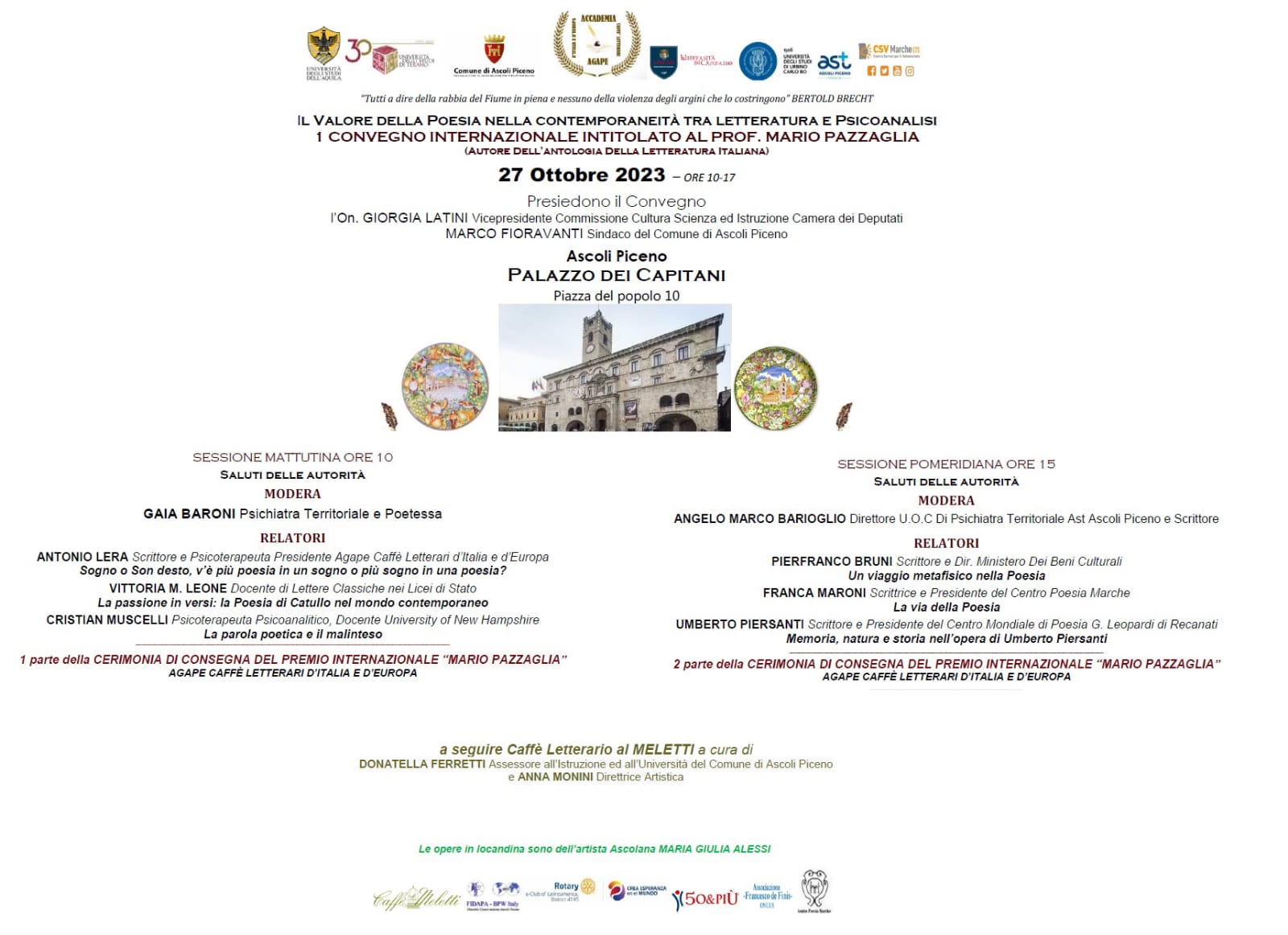 Il Premio ha ospitato anche il primo convegno internazionale “Il valore della Poesia nella contemporaneità tra Letteratura e Psicoanalisi” intitolato al professor Mario Pazzaglia, docente emerito di Lingua e Letteratura italiana presso la Facoltà di Scienze della Formazione dell’Università di Bologna, nonché Presidente e Fondatore dell’Accademia Pascoliana e prestigioso autore dell’Antologia della Letteratura Italiana.
