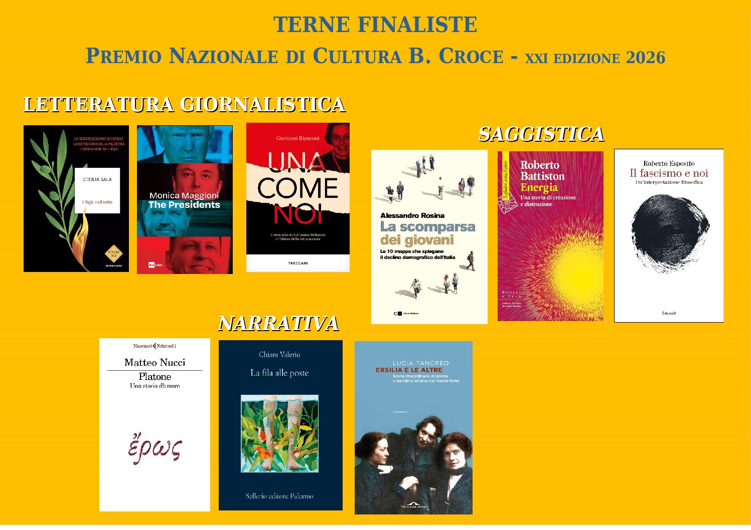– Per la Saggistica: “La scomparsa dei giovani”, di Alessandro Rosina, editore Chiarelettere; “Energia” di Roberto Battiston, editore Raffaello Cortina; “Il fascismo e noi”, di Roberto Esposito, editore Einaudi. Menzione speciale della Giuria, a “L’orso e la formica”, di Tosoni, D’Amicis, Esposito, edizioni del PNALM. I “giurati popolari” avranno da ora due mesi circa per leggere ed esprimere il loro giudizio, scegliendo quelli che a parere loro sono i più degni di vincere il Premio Croce 2026. Lo comunicheranno il 21 maggio, nel corso dell’assemblea conclusiva del loro lavoro che, in occasione “dell’Aquila Capitale Italiana della Cultura” si terrà nel capoluogo di Regione.