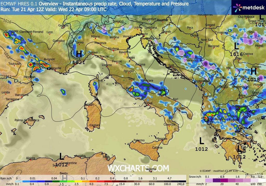 PREVISIONE: Sulla nostra regione si prevedono condizioni iniziali di cielo nuvoloso o molto nuvoloso con precipitazioni sparse, inizialmente più probabili nel Teramano e nel Pescarese, ma in estensione verso il Chietino e verso le zone interne entro la tarda mattinata: non si escludono rovesci temporaleschi, più probabili sulle zone collinari e sul versante adriatico. Nevicate sui rilievi al disopra dei 1800-2000 metri, localmente anche a quote lievemente inferiori entro il primo pomeriggio, tuttavia la tendenza è verso una graduale attenuazione della nuvolosità e delle precipitazioni ad iniziare dalle zone collinari e costiere dal pomeriggio, in estensione verso le zone interne e montuose entro la serata, con schiarite via via sempre più ampie. Il miglioramento proseguirà nella giornata di giovedì.