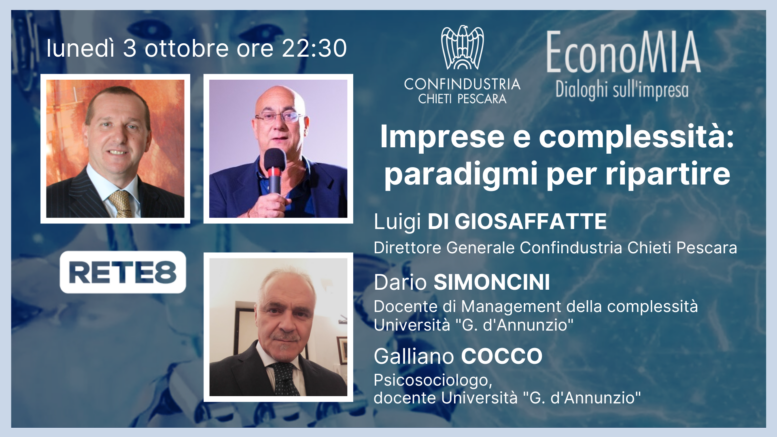 Saranno nostri ospiti: Luigi DI GIOSAFFATTE, Direttore Generale Confindustria Chieti Pescara- Dario SIMONCINI, Docente di Management della complessità Università “G. d’Annunzio”, Galliano COCCO Psicosociologo, docente Università “G. d’Annunzio”. Potrete seguirci in tv su #Rete8, canale 10, oppure in streaming al seguente link: https://bit.ly/3FoZzqF