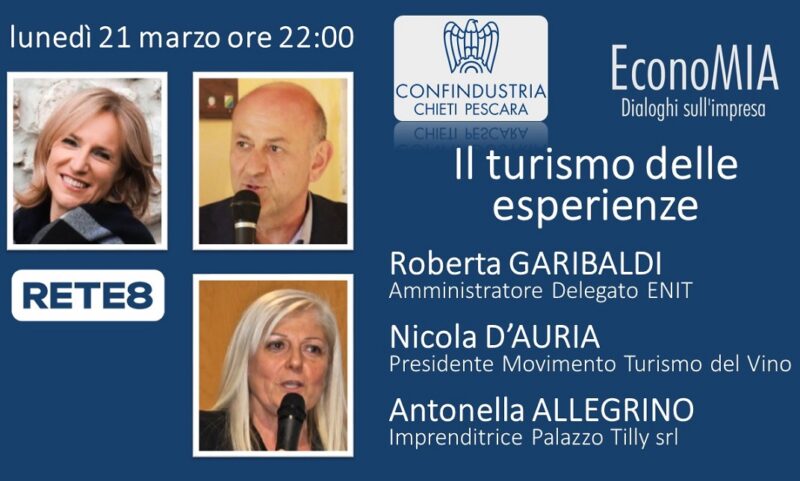 Vi aspettiamo lunedì 21 marzo ad “EconoMIA, dialoghi sull’impresa”, format tv di Confindustria Chieti Pescara e Rete 8, con una nuova puntata dedicata al tema “Il #turismo delle #esperienze”.