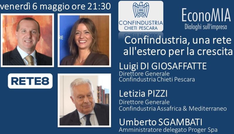 Venerdì 6 maggio alle ore 21:30 “#EconoMIA, dialoghi sull’impresa”, format tv di Confindustria Chieti Pescara e Rete8, per una nuova puntata dedicata al tema “Confindustria, una rete all’estero per la crescita”