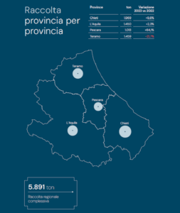Tutte le province contribuiscono all’incremento dei volumi complessivi, fatta eccezione per quella di Teramo (-21,7%) che scende a 1.459 tonnellate. La provincia di Pescara registra la miglior performance (+64,1%) che porta i volumi raccolti a 1.013 tonnellate. La raccolta