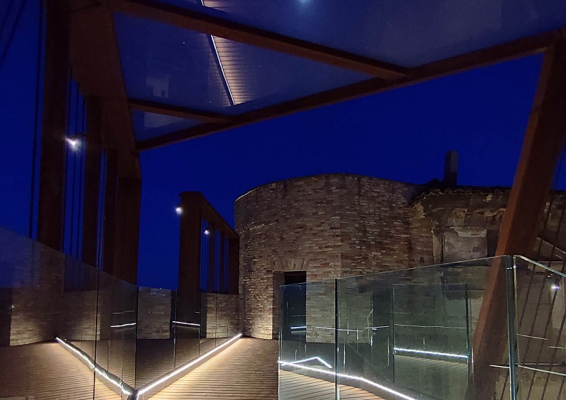 PORTA GABELLA – L’intervento di Valentini, codificatore di un “metodo” che ha firmato importanti interventi di recupero e riqualificazione di strutture vitivinicole abruzzesi premiate in ambito internazionale, ha previsto l’inserimento di un elemento architettonico ben distinguibile dal contesto: una struttura in acciaio corten, racchiusa da un involucro formato da corde verticali, che parla “un linguaggio contemporaneo intriso di echi e riflessi di architetture medievali”. La sua forma, una interpretazione onirica della porta medievale, suggerisce l’immagine metaforica di due ante stilizzate che si aprono verso l’esterno. Le passerelle sospese, che collegano le varie strutture, sono ispirate dalle passerelle medievali in legno, addossate alle cinte di fortificazione, che permettevano il collegamento tra le torri difensive. Dove un tempo sorgeva porta Gabella, vi era solo un’ampia scalinata. Da ricerche storiche, lo studio delle planimetrie e testimonianze fotografiche, è stato possibile ricostruire l’aspetto originario della porta. Essa risultava essere connessa con l’edificio adiacente per mezzo di una struttura in muratura trasversale, che permetteva il passaggio diretto tra i due corpi, e rendeva accessibili tutti i piani della Torre.
