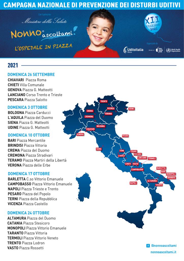 La dodicesima edizione della campagna partirà il 26 settembre e il programma si snoderà su 5 domeniche (fino al 24 ottobre) coinvolgendo circa 20 piazze con medici specialisti e tecnici dell’udito che per un’intera giornata saranno a disposizione dei cittadini nelle piazze di riferimento.