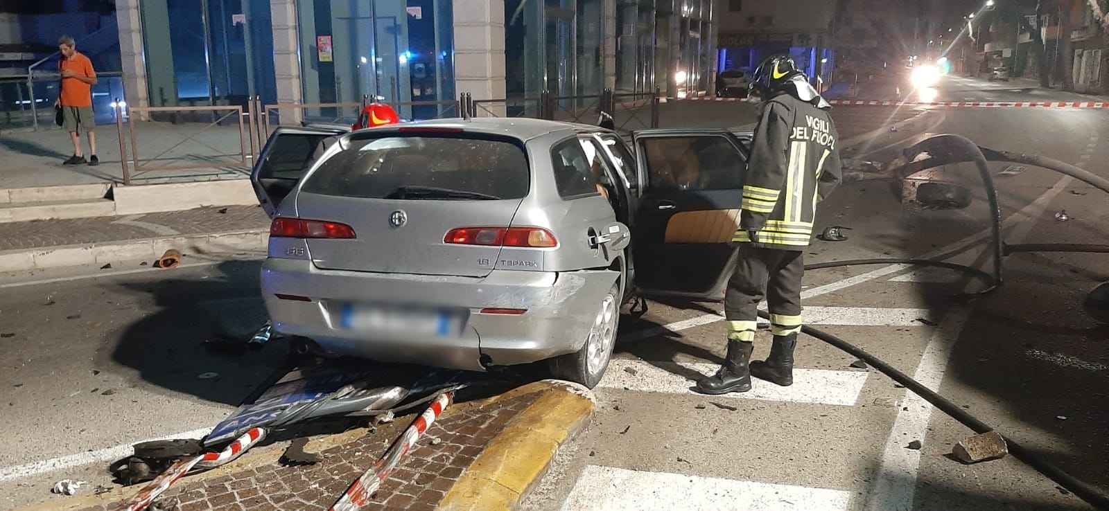 Nella notte i vigili del fuoco hanno effettuato un intervento per un incidente avvenuto sulla rotonda che collega la SS16 con la SS150. L’Alfa Romeo 156 station wagon ha tagliato la rotonda impattando con un palo dell’illuminazione pubblica sradicandolo e lanciandolo a diversi metri di distanza. L’auto ha fermato la sua corsa abbattendo la segnaletica stradale dello spartitraffico. Illese le cinque persone a bordo