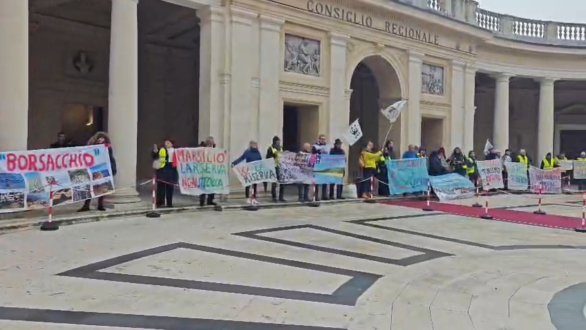 Le associazioni ambientaliste e i comitati contrari alla riduzione dell’area della Riserva del Borsacchio hanno protestato sotto la sede del consiglio Regionale all’Aquila