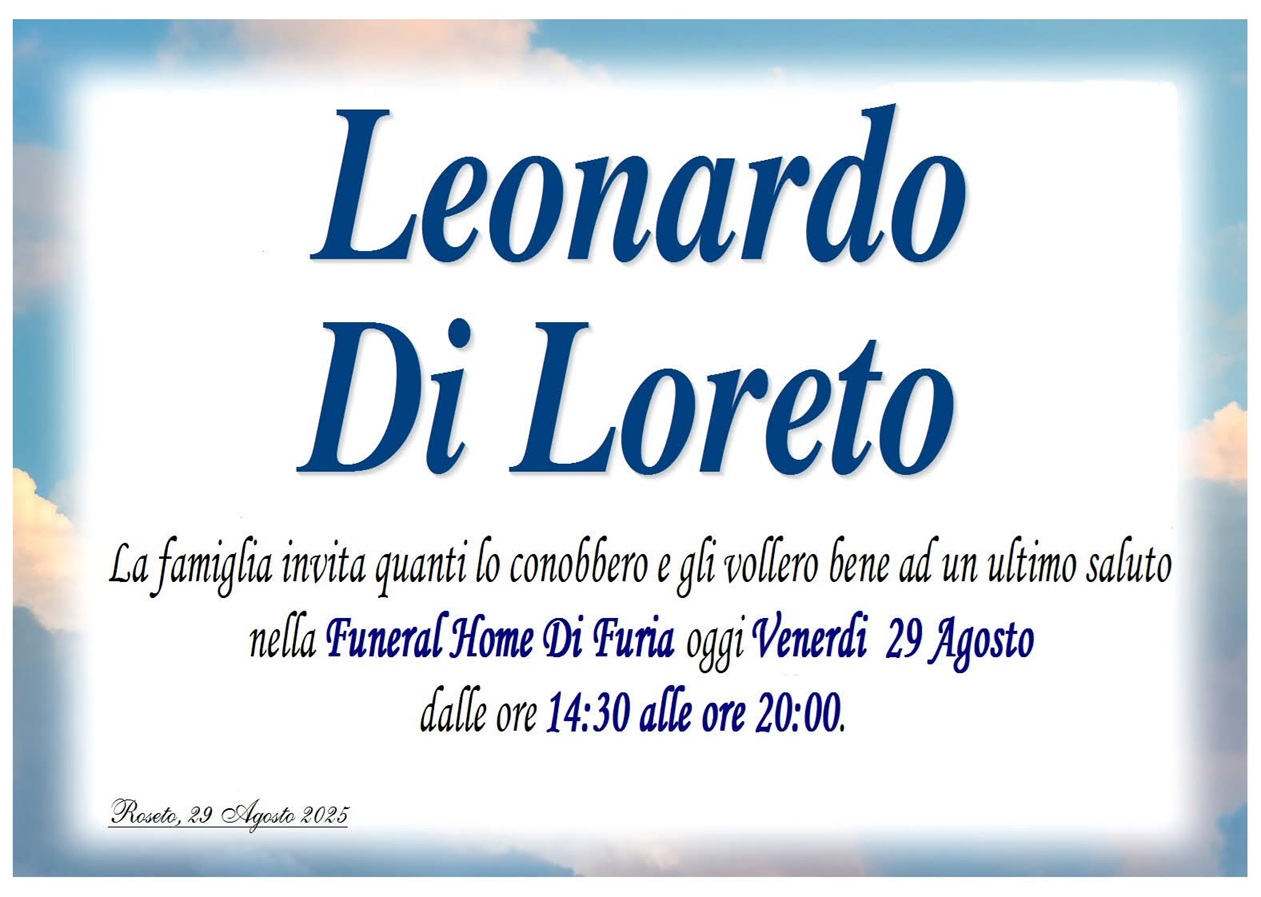 Nella giornata di oggi, venerdì 29 agosto, dalle 14.30 alle ore 20, la salma di Leonardo è stata esposta presso la Funeral Home Di Furia, sulla Statale 150, a Pianura Vomano di Notaresco. Non saranno celebrati funerali.
