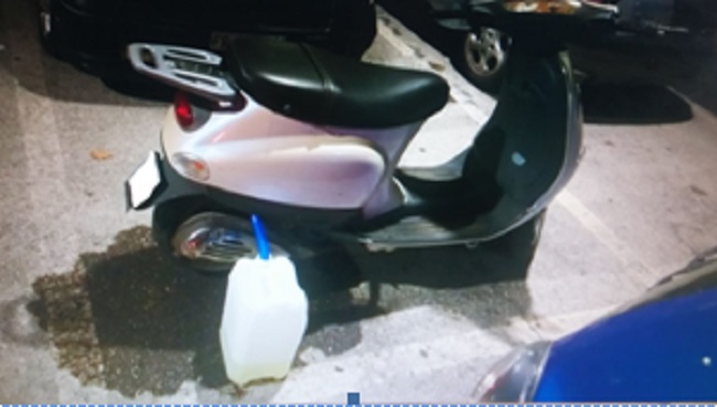 A seguito di accurato sopralluogo, si è inoltra appurata la presenza di una tanica, con all’interno benzina, collegata con un tubo allo scooter in parola e, dopo aver altresì accertato la presenza di un altro uomo all’interno di una smart, nelle vicinanze parcheggiata, i militari hanno compreso sin da subito che si trattasse proprio del complice, ipotesi questa peraltro immediatamente confermata dall’esito della perquisizione veicolare in quanto è stata rinvenuta all’interno di tale auto una seconda tanica della stessa foggia.
