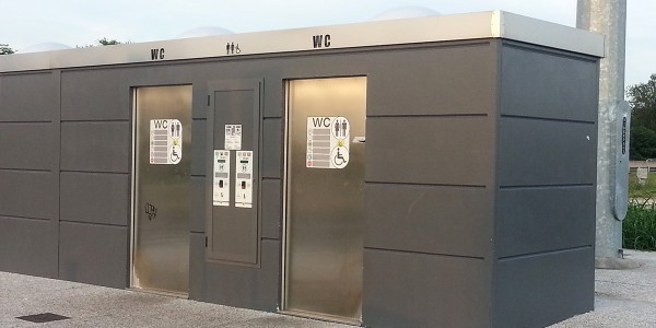 “c’è un diplay che fornisce tutte le indicazioni dopo averne impostato la lingua (a scelta tra italiano, spagnolo, tedesco, francese, inglese). Inseriti i 20 centesimi, la porta scorrevole si apre e richiudendosi solo dopo avere ‘registrato’ il peso dell’utente. Dentro ci sono i servizi, tutti accessibili anche a persone con disabilità, dal water al lavandino, al sapone al distributore di carta asciugamani. In un angolo c’è anche il fasciatoio per le mamme. Il bagno è collegato alla rete fognante. Un volta usciti automaticamente si attiva il processo di pulizia e disinfezione di tutto l’ambiente interno”.